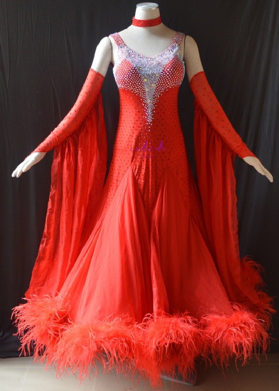 KAKA DANCE B1443,Red Ostrich feather Ballroom Standard Dance Dress,Waltz Dance Competition Dress,Women,Girl,Ballroom